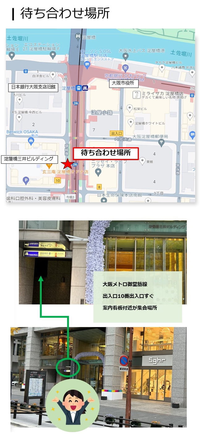 | アクセス | ※当日はA5サイズの黄色いクリアファイルを持ったスタッフにお声がけくださいませ。 待ち合わせ場所付近は一般の方も多いので、スタッフからのお声がけはできかねますので、必ずお客様からスタッフにお声がけくださいませ。 地下鉄御堂筋線「淀屋橋」駅直結(10号出口) 京阪本線「淀屋橋」駅 3番出口から徒歩1分 地下鉄堺筋線「北浜」駅 2番出口から徒歩8分 |