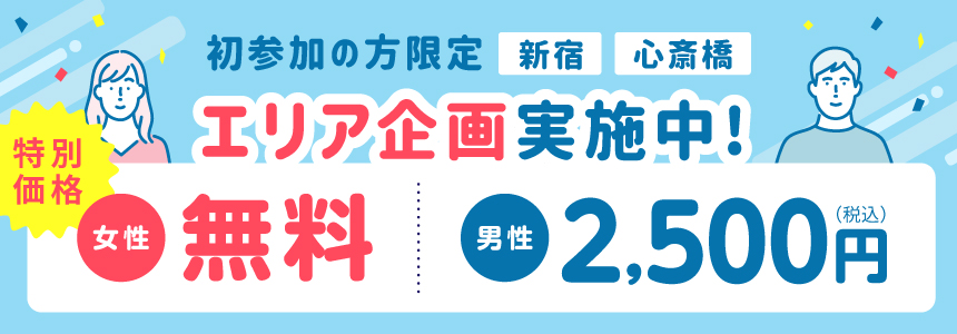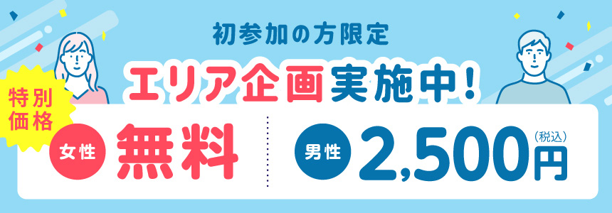 現在フィオーレパーティーでは、特定エリアにおいて【初参加の方限定★特別価格】のご案内をしております!【男性2500円/女性無料】