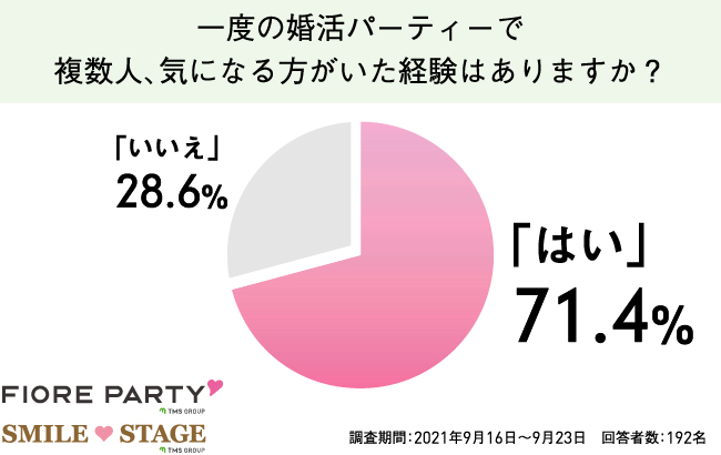 「1度の婚活パーティーで複数人、気になる方がいた経験はありますか?」という質問に、71.4%の方が「はい」と回答しました。1つのパーティーでマッチングするお相手が1人という婚活パーティーが大半の中、複数人を気になった方が多いことがわかりました。