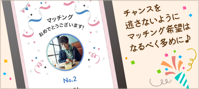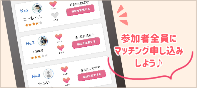 1回目でカップリングされなかった方が男女1名様ずついらっしゃった場合は2回目のマッチングに進む事が出来ます。