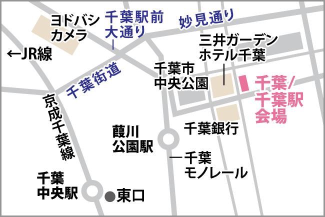 JR総武線千葉駅から徒歩10分以内、千葉モノレール葭川公園駅から徒歩2分、京成千葉線千葉中央駅から徒歩10分にある千葉サロン。清潔感のある個室スペースでお話いただけます。