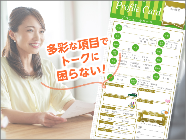 プロフィールカードを交換してお話ししていただくので初対面の方でも会話が困る事はありません。