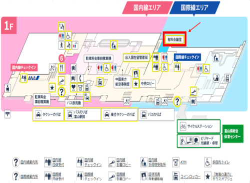 富山空港ターミナルビルの国際線1F、中央ロビーよりトイレ方面に進み突き当りが有料会議室です。
