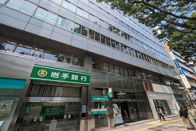 JR仙台駅西口を出てあおば通りをイオン仙台に向かって進むと、イオン仙台と同じ並びで、駅寄りに一つ手前のビルがパーティー会場です。ビルの1階には岩手銀行が入っています。