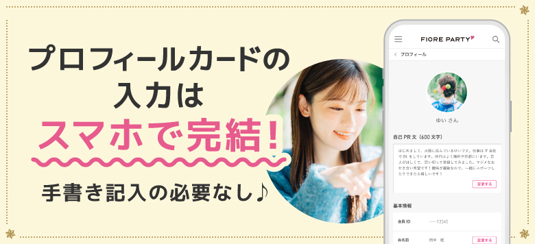 こちらのイベントはスマホスタイルですので、普段使い慣れた自分のスマートフォンを使って参加していただけます。プロフィールカードの手書き記入は一切不要で、スマホに入力をしていただき、パーティー中も、お相手のプロフィール閲覧からマッチングの申し込みまですべてスマホひとつで完結します。