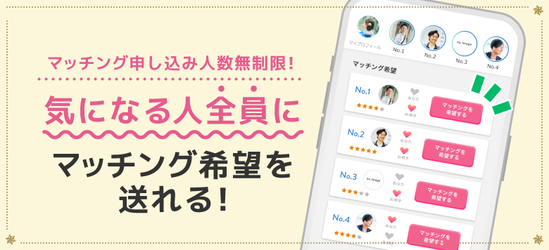 マッチング申し込み人数は無制限!もっと話してみたいというお相手全員にマッチングの申し込みを送ることも可能なので、チャンスが広がります♪