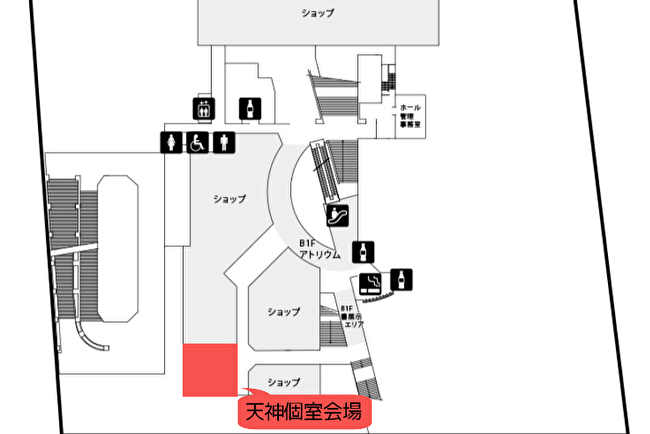 【地下1Fからお越しの場合】                                                                     福岡天神のパーティー専用個室会場は天神駅直結、アクロス福岡の地下1階です。                              正面玄関よりまっすぐ進んだ先にエスカレーターがございますので下っていただき、左側に自動販売機・喫煙スペースがあるエリアを直進します。                                                                                階段手前を右手に進み 突き当りウエディングドレスを飾っておりますのが当会場になります。                                                                                                                                                                                                                                                            【地下2Fからお越しの場合】                                                     地下鉄16番出口からアクロス福岡に直結しております。道順に沿って進みますと右手にロッテリアがございますので。             左手のエスカレーターを上がっていただき、YAMAHAミュージックを正面に見た際に左側に進みます。                     右手エリアに銀座いち利さんやbloom(補聴器)さんがございますので、直進するとウエディングドレスを飾っておりますのが当会場になります。