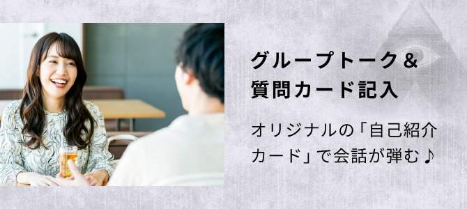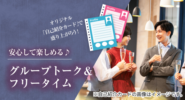 参加者同士が気軽に話せるグループトークと、自由に交流できるフリータイムをご用意!話のきっかけとなる「自己紹介カード」を使えば自然に会話が弾みます♪二コラさんもグループトークに参加し、皆さんの新たな出会いを応援! さらに「気になる人と話せなかった」とならないよう、人数に応じてフリータイム中にシャッフルタイムも実施します♪