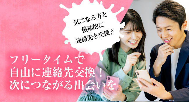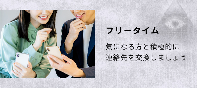 フリータイム中は連絡先交換が自由にできます!気になる方やもっとお話ししたい方がいらっしゃいましたら、ぜひこのタイミングで連絡先を交換してください。イベント後も交流が続く、素敵なご縁につながるチャンスです。気軽に声をかけ合って、新たな出会いを楽しみましょう♪♪