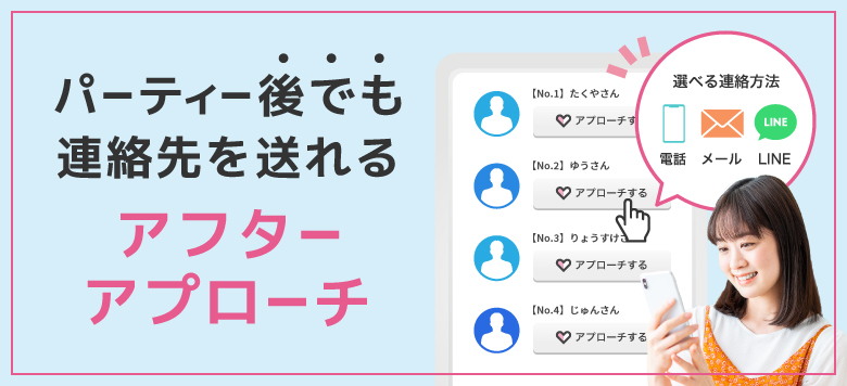 それだけではなく、マッチングできなかったお相手に、無料でご自身の連絡先を送ることができるので、パーティー終了後にもチャンスがあります♡